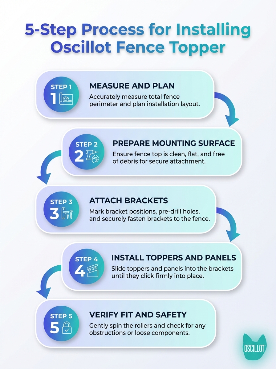 This infographic highlights best practices for installing the Oscillot Fence Topper. It walks through a clear 5-step process to help ensure a secure and effective installation.